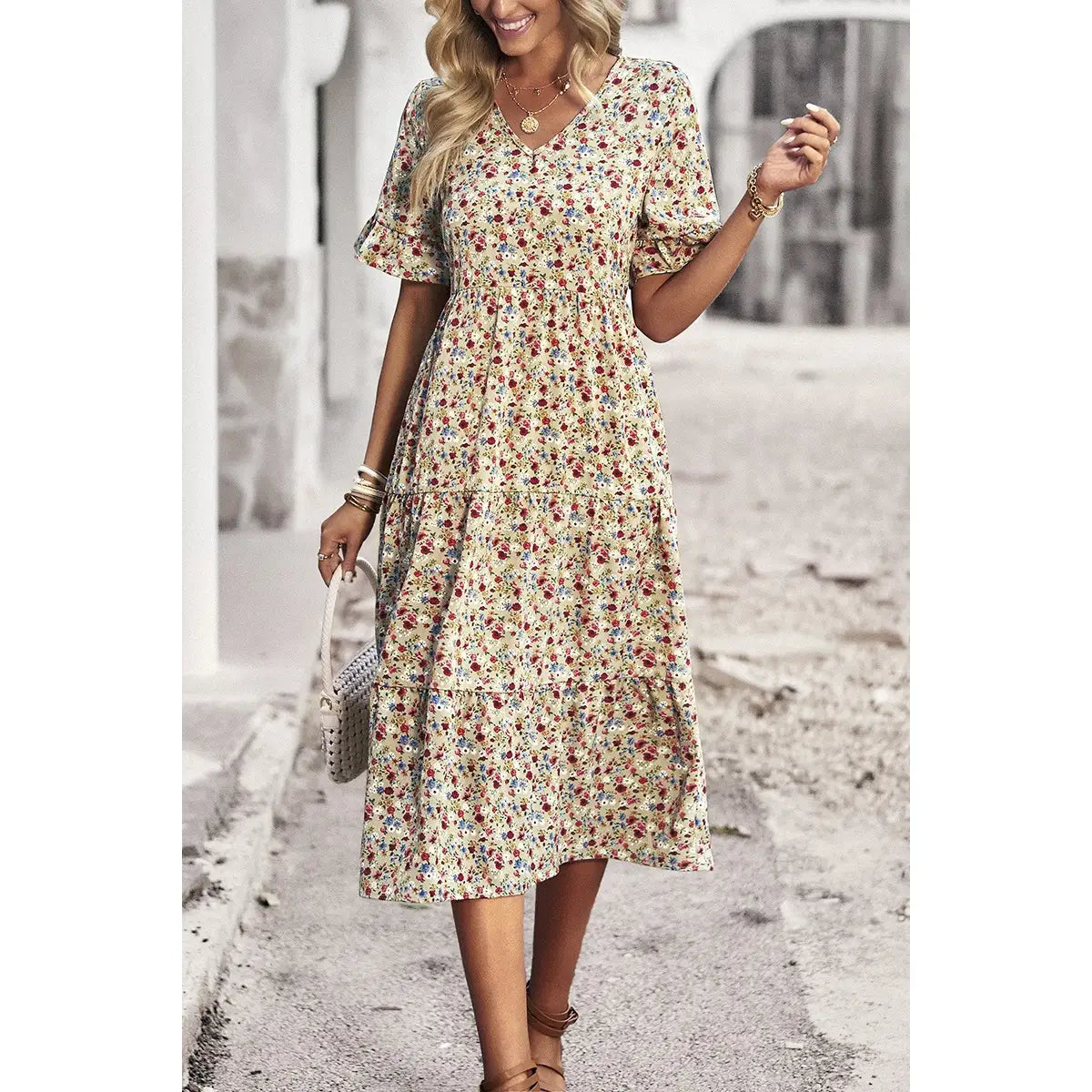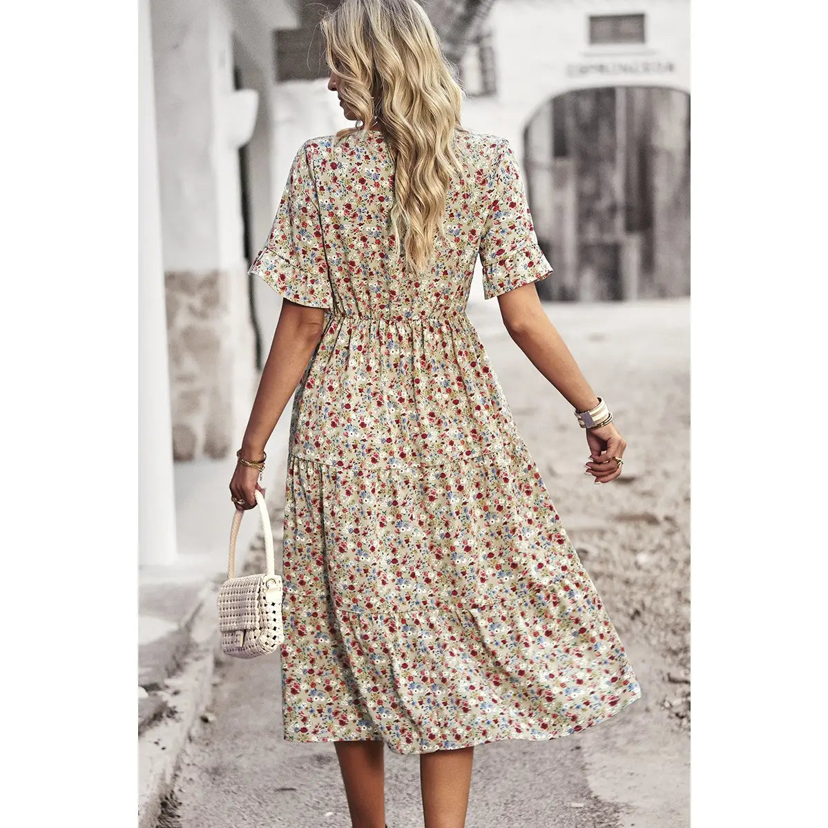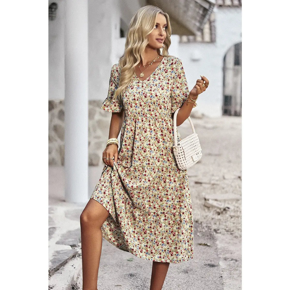 Boho Floral Ruffle Hem V Neck Short Sleeve Dress
