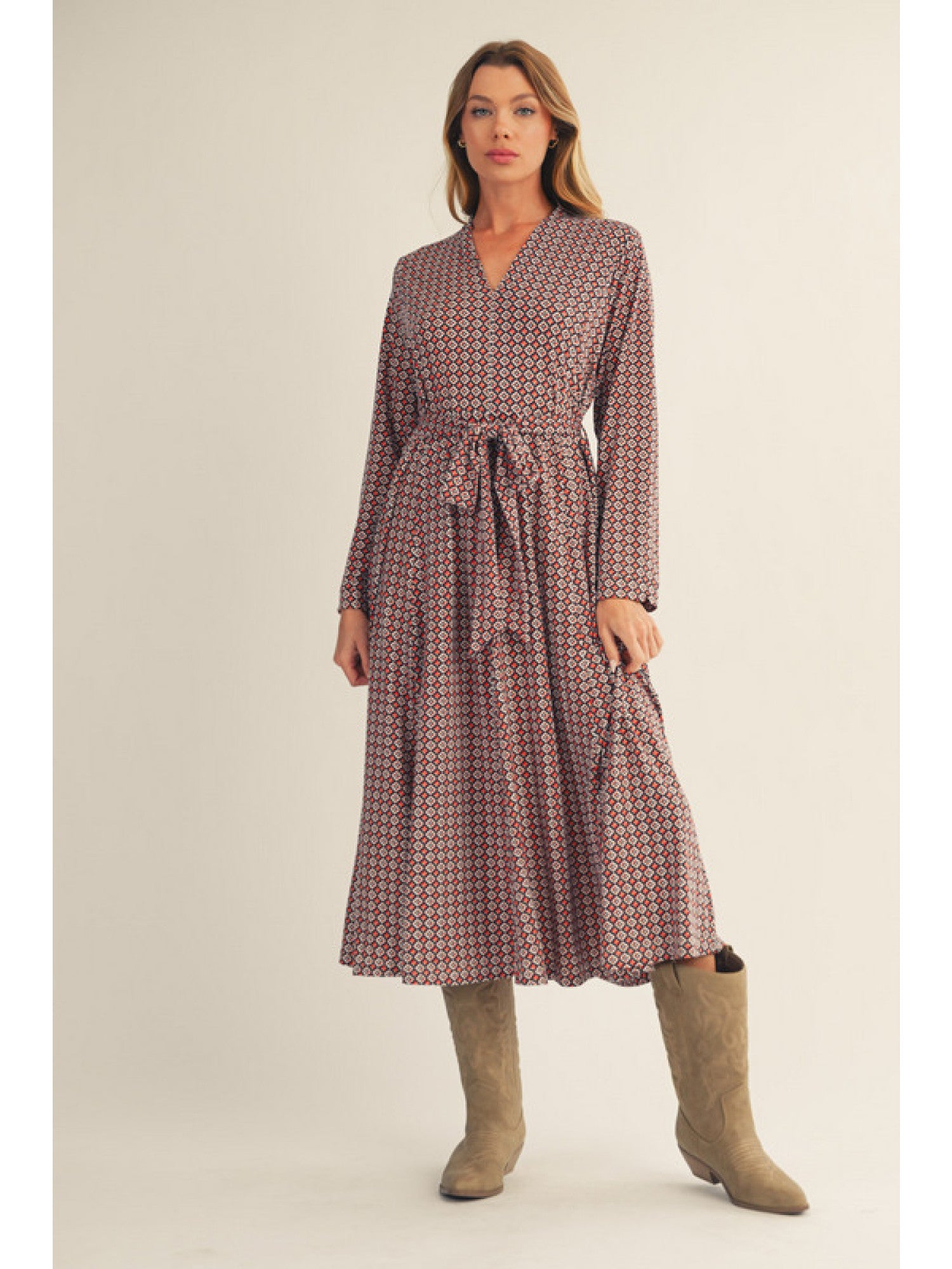 Long sleeves repetitive pattern flare midi dress with waist tie.