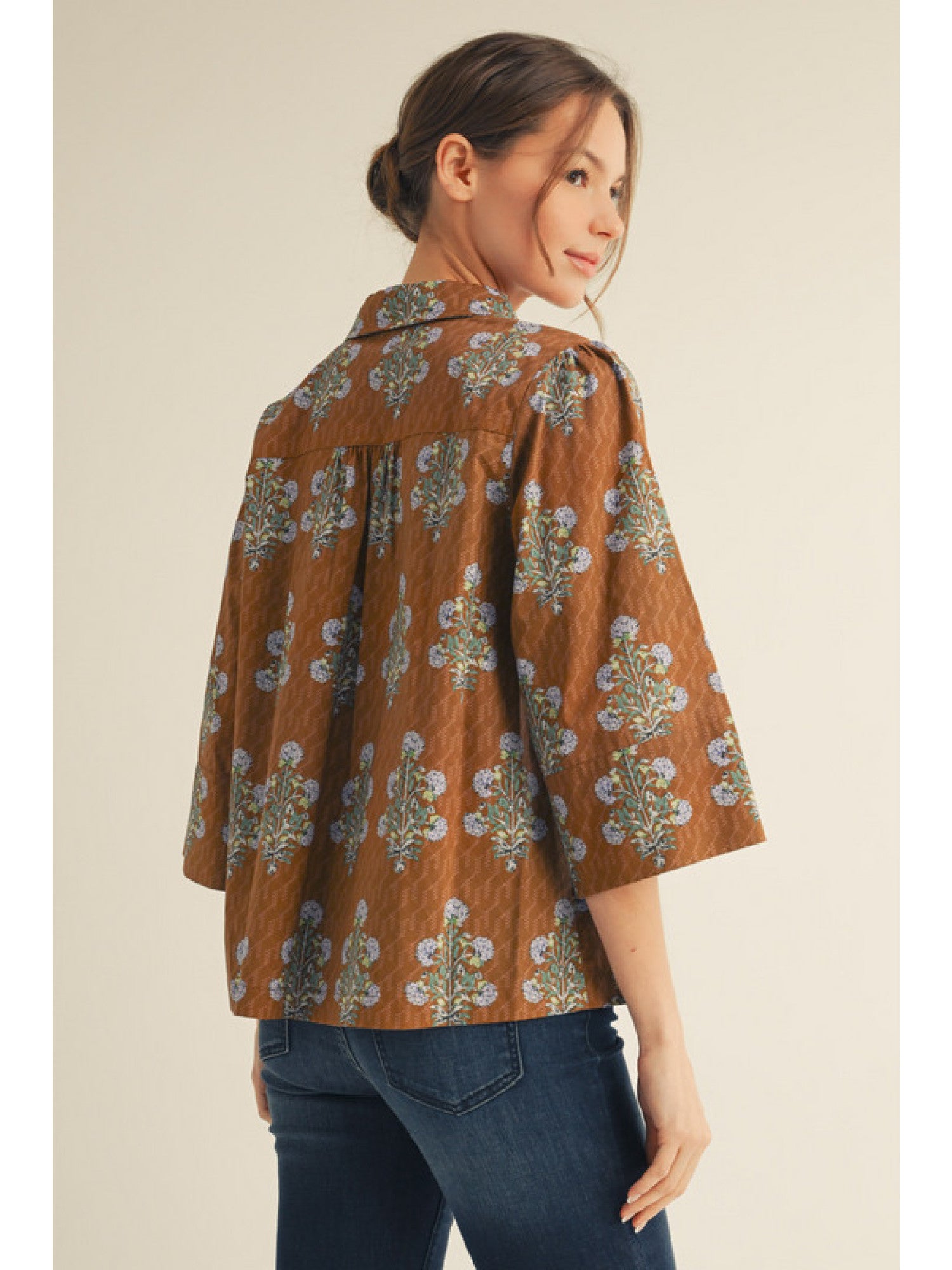 3/4 sleeves floral top with stripe contrast, collared v neckline.