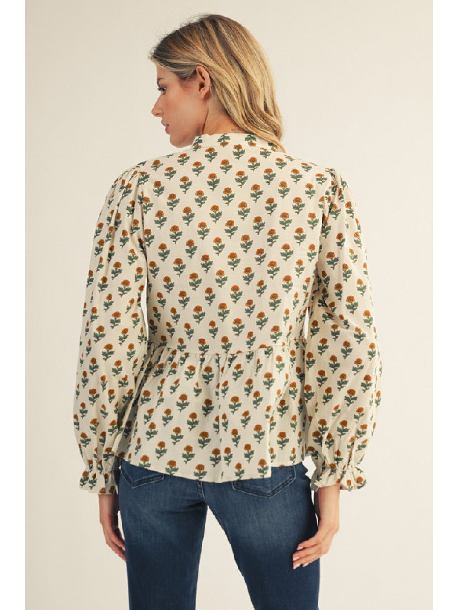 Ruffled long sleeves floral peplum top with lace trim.- Model is 5'7'' and is wearing a Small.