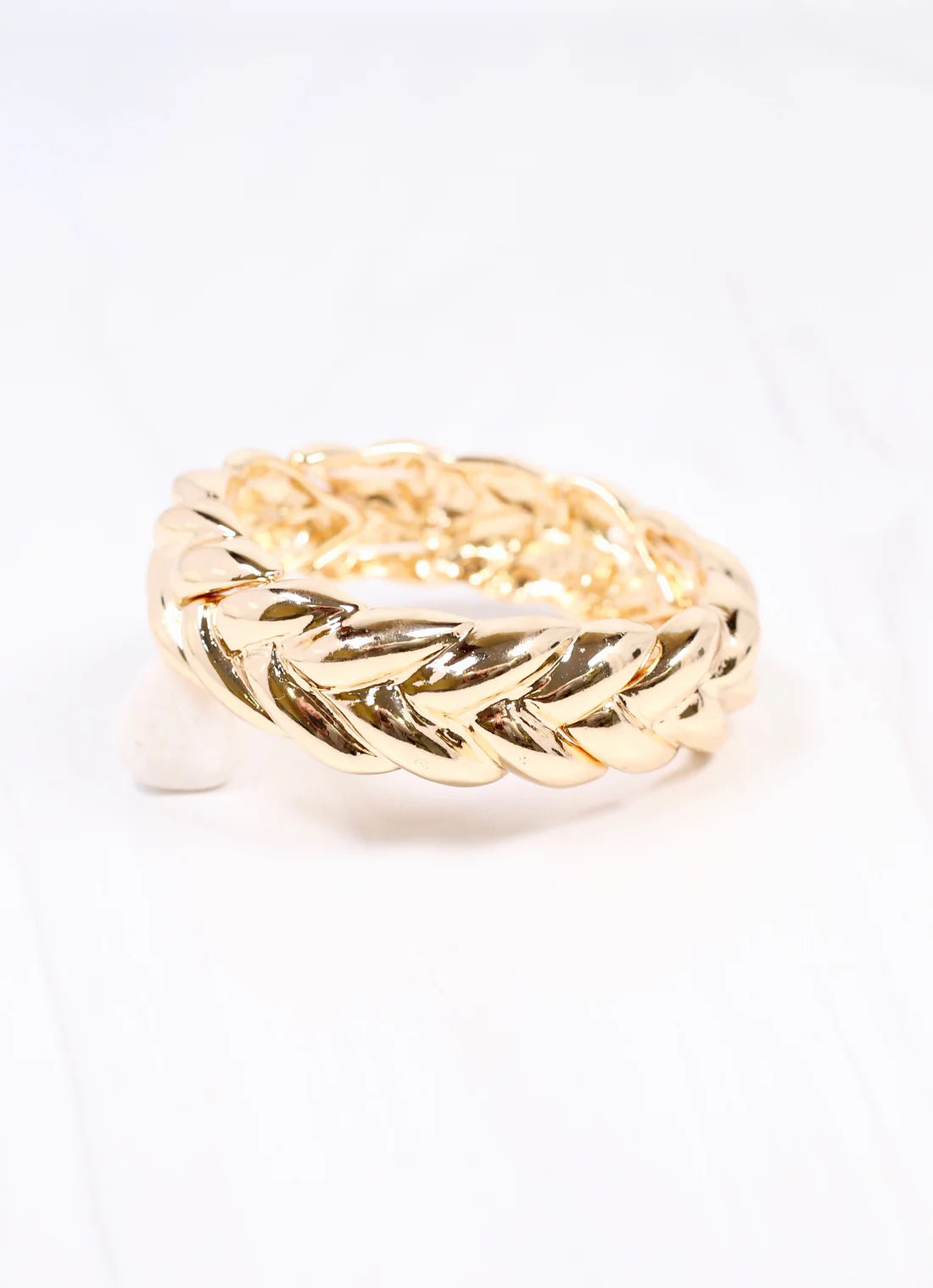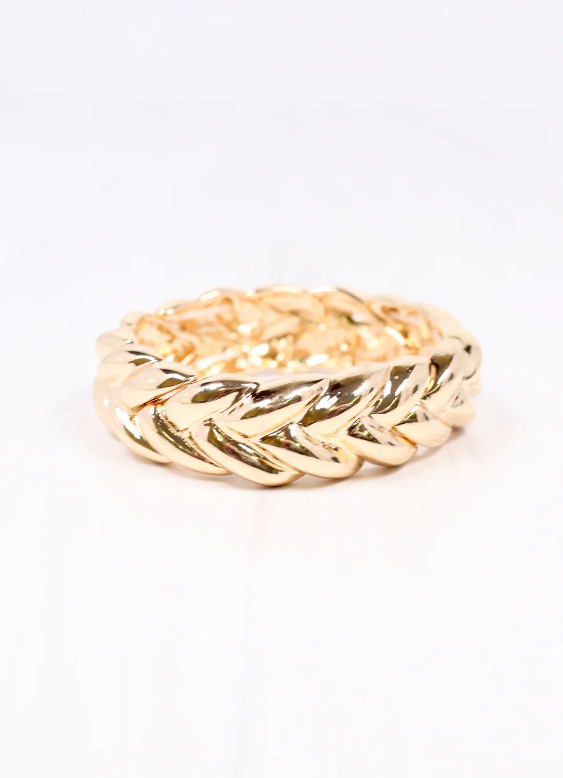 This bracelet is a great staple to have in your accessory closet. It has a shiny metal finish and a great classy design. Stretches to fit most wrists. Brass and gold dipped.