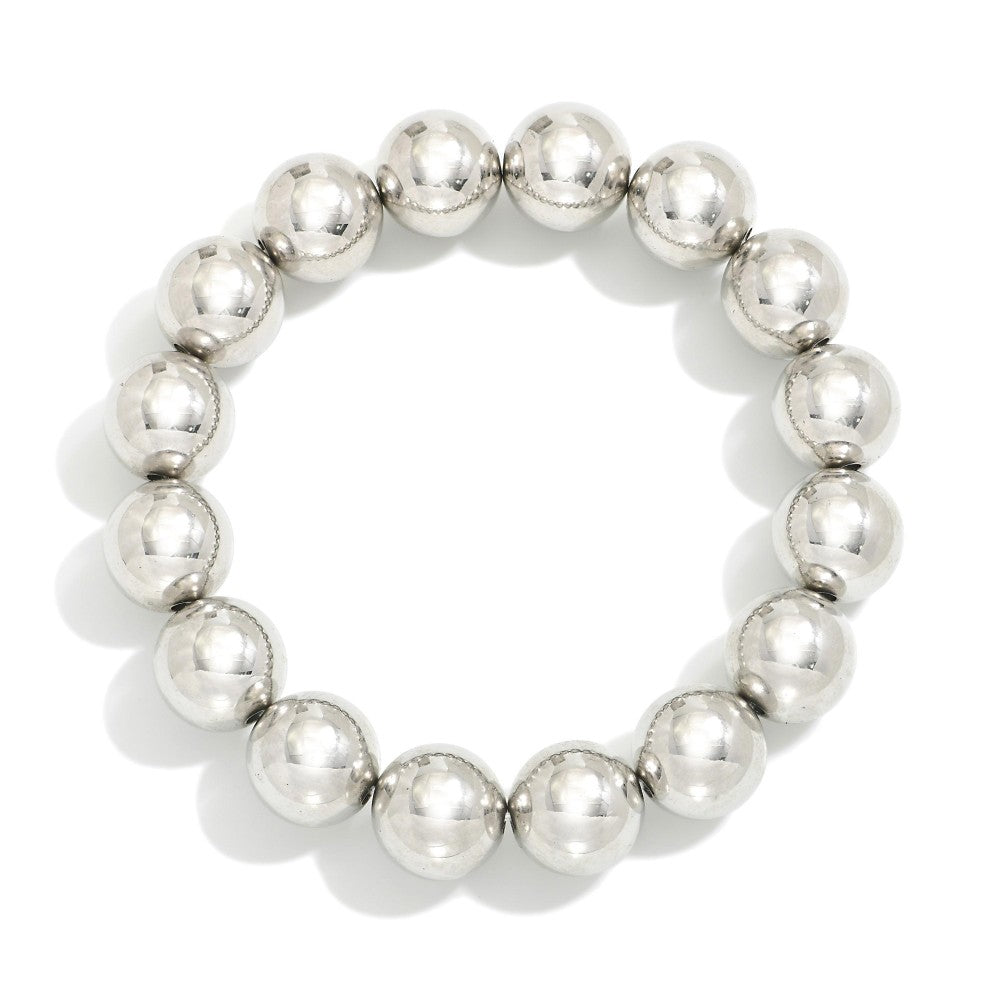 This playful stretch bracelet features shiny metal-toned beads and measures about 2.5 inches in diameter, adding a fun pop to any outfit.