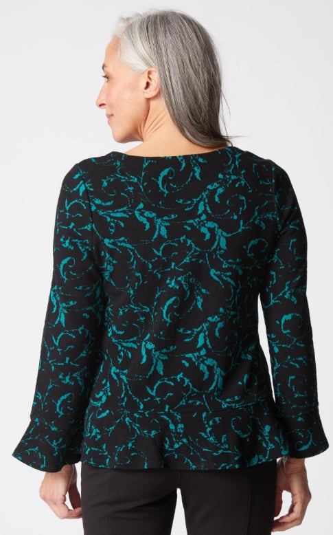 The Jacquard Scroll Peplum Top brings a playful twist to classic elegance with its authentic knit jacquard fabric. Flounce sleeves and hem details add a fun, flirty flair, making it perfect for turning heads at any casual outing or festive get-together. Embrace a stylish mix of comfort and charm in this unique peplum design.